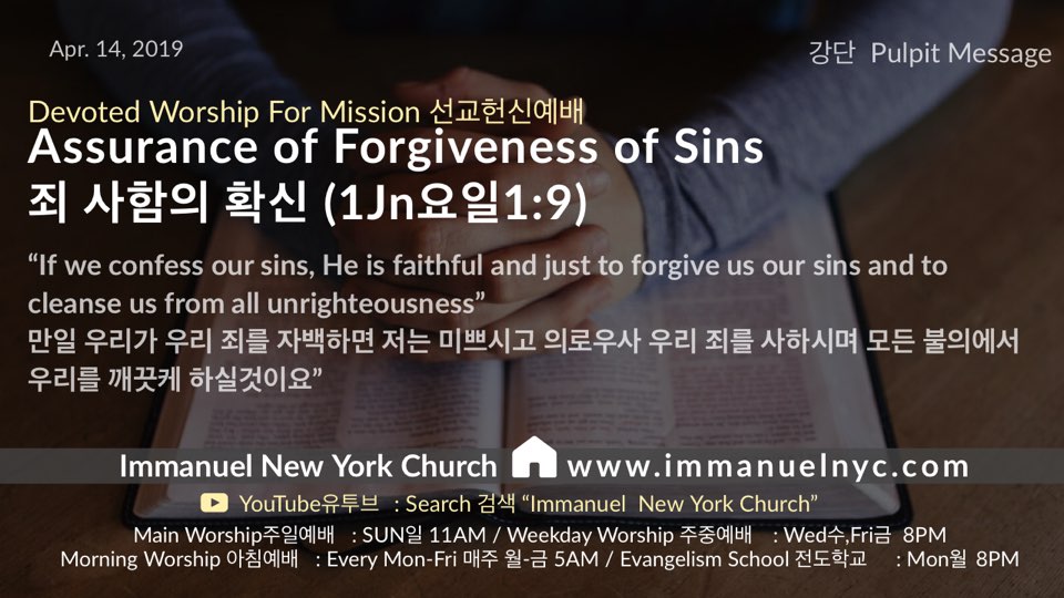 (요일1:9) “만일 우리가 우리 죄를 자백하면, 저는 미쁘시고 의로우사 우리 죄를 사하시며 모든 불의에서 우리를 깨끗케 하실 것이요”