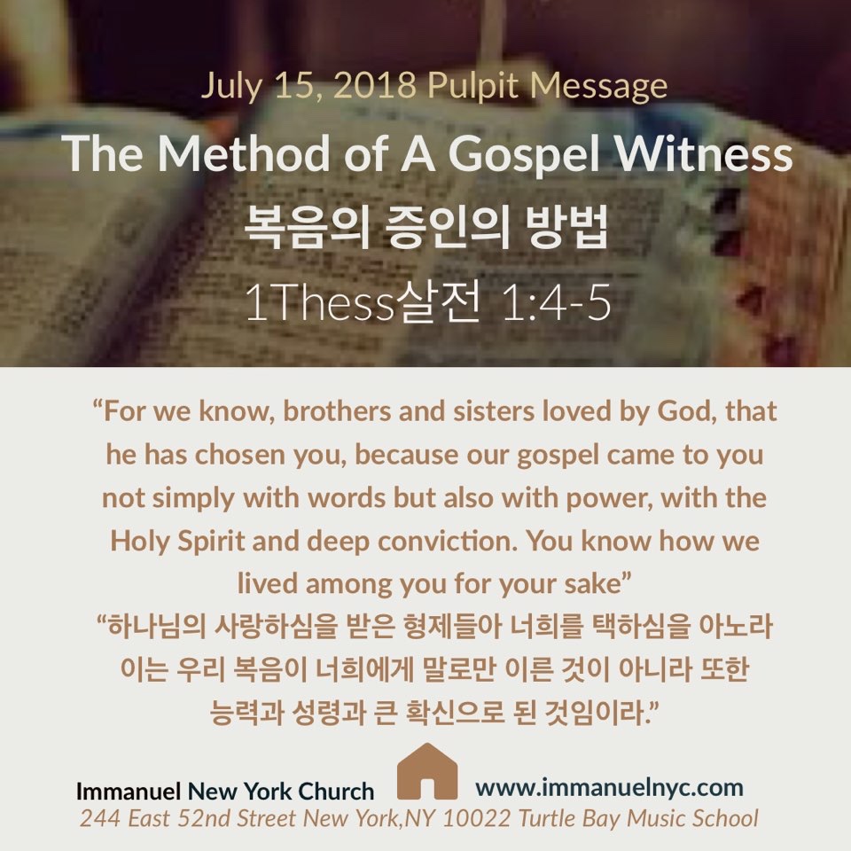 살전1:4-5 이는 우리 복음이 너희에게 말로만 이른 것이 아니라 또한 능력과 성령과 큰 확신으로 된 것임이라 우리가 너희 가운데서 너희를 위하여 어떤 사람이 된 것은 너희가 아는 바와 같으니라