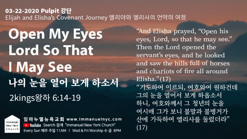 17 기도하여 이르되 여호와여 원하건대 그의 눈을 열어서 보게 하옵소서 하니 여호와께서 그 청년의 눈을 여시매 그가 보니 불말과 불병거가 산에 가득하여 엘리사를 둘렀더라