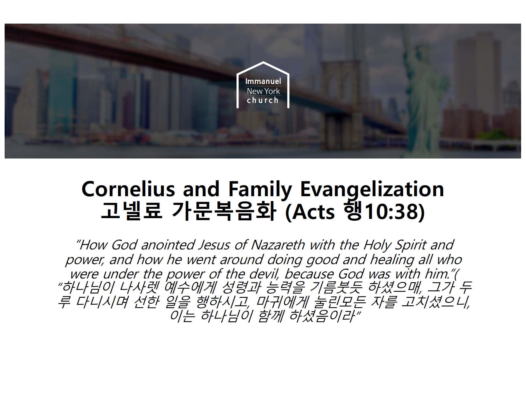 “하나님이 나사렛 예수에게 성령과 능력을 기름붓듯 하셨으매, 그가 두루 다니시며 선한 일을 행하시고, 마귀에게 눌린모든 자를 고치셨으니, 이는 하나님이 함께 하셨음이라”