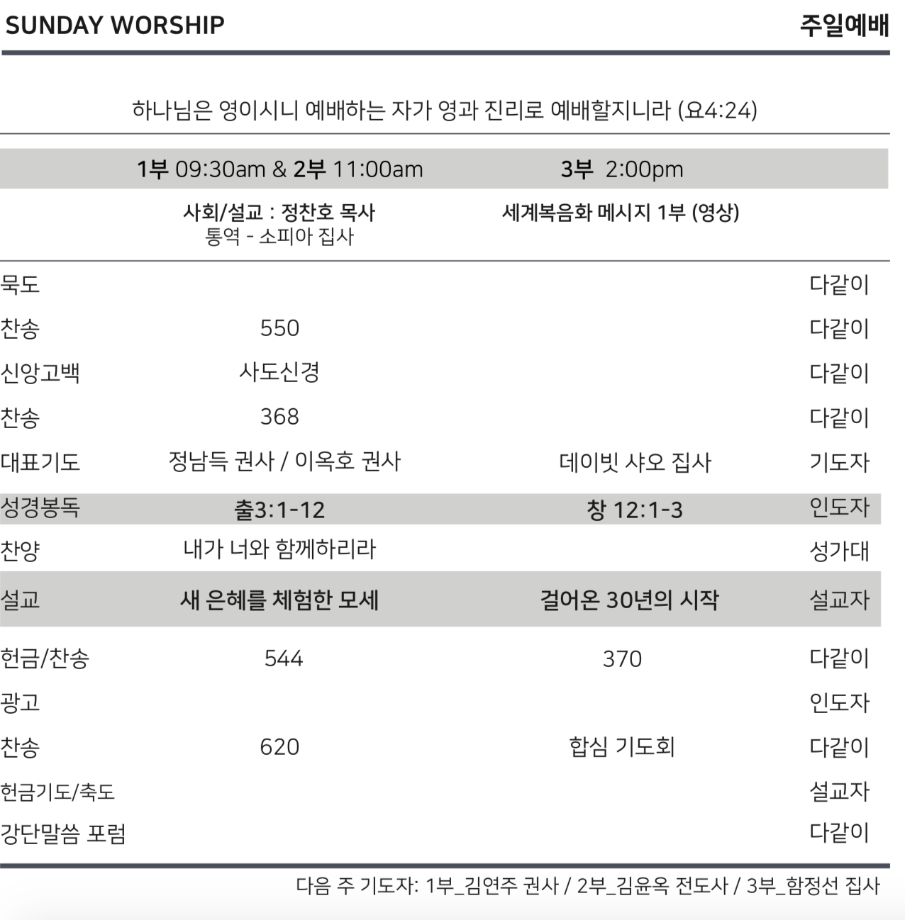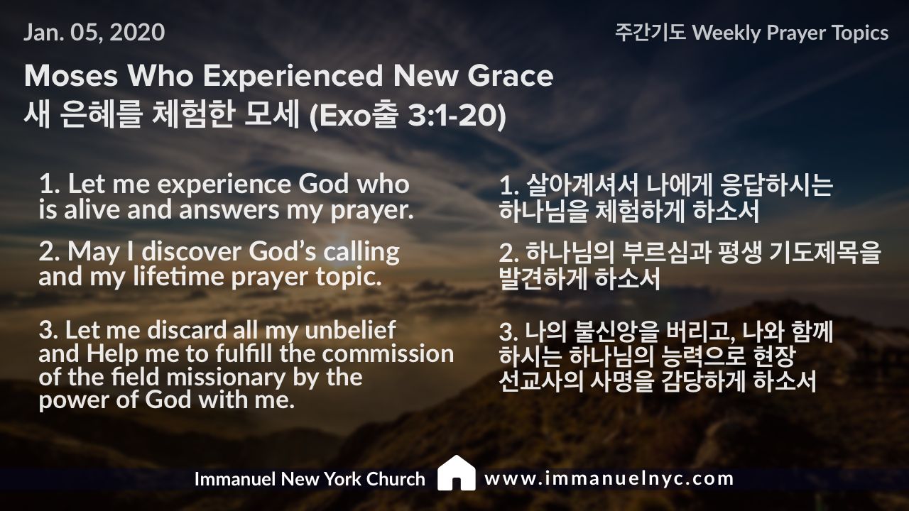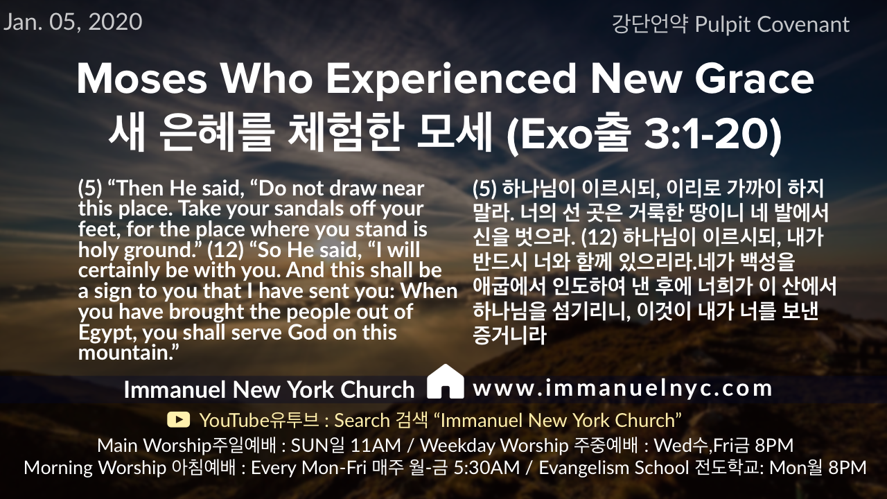[Ex 출 3:1-20] Moses Who Experienced New Grace 새 은혜를 체험한 모세 by immanuelnyc1@gmail.com Posted on January 4, 2020January 5, 2020 https://immanuelnyc.com/wp-content/uploads/2020/01/20200105-Moses-Who-Experienced-New-Grace-새-은혜를-체험한-모세.mp3 [tabgroup][tab title=”English” state=”active”] [/tab][tab title=”한글”] [/tab][/tabgroup] [line]