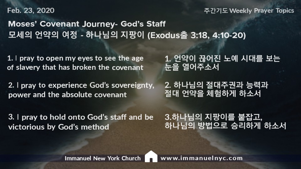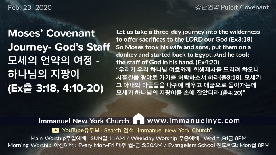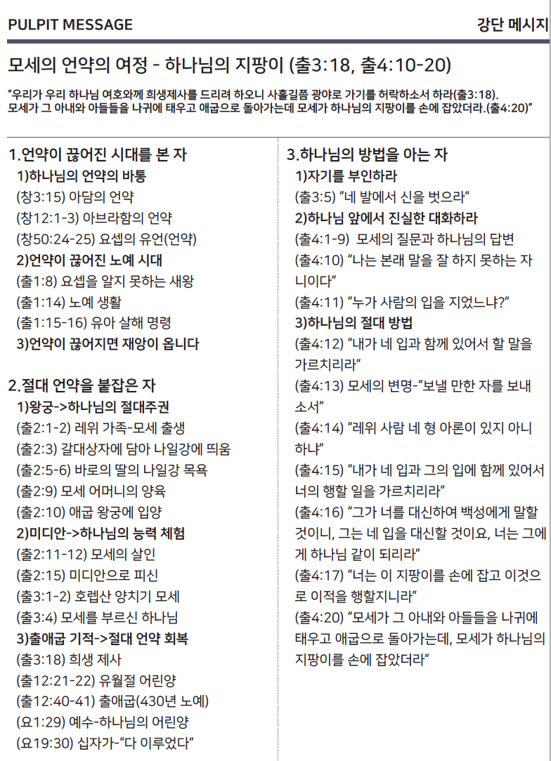 “우리가 우리 하나님 여호와께 희생을 드리려 하오니 사흘길쯤 광야로 가기를 허락하소서 하라. 모세가 그 아내와 아들들을 나귀에 태우고 애굽으로 돌아가는데, 모세가 하나님의 지팡이를 손에 잡았더라.”