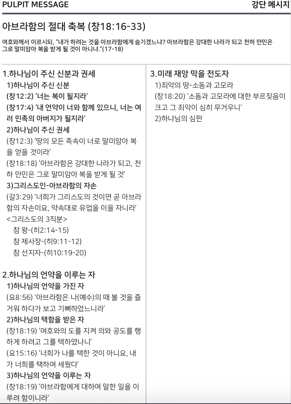 16 그 사람들이 거기서 일어나서 소돔으로 향하고 아브라함은 그들을 전송하러 함께 나가니라 17 여호와께서 이르시되 내가 하려는 것을 아브라함에게 숨기겠느냐 18 아브라함은 강대한 나라가 되고 천하 만민은 그로 말미암아 복을 받게 될 것이 아니냐 19 내가 그로 그 자식과 권속에게 명하여 여호와의 도를 지켜 공의와 정의를 행하게 하려고 그를 택하였나니 이는 나 여호와가아브라함에게 대하여 말한 일을 이루려 함이니라 20 여호와께서 또 이르시되 소돔과 고모라에 대한 부르짖음이 크고 그 죄악이 심히 무거우니 21 내가 이제 내려가서 그 모든 행한 것이 과연 내게 들린 부르짖음과 같은지 그렇지 않은지 내가 보고 알려 하노라 22 그 사람들이 거기서 떠나 소돔으로 향하여 가고 아브라함은 여호와 앞에 그대로 섰더니 23 아브라함이 가까이 나아가 이르되 주께서 의인을 악인과 함께 멸하려 하시나이까 24 그 성 중에 의인 오십 명이 있을지라도 주께서 그 곳을 멸하시고 그 오십 의인을 위하여 용서하지 아니하시리이까 25 주께서 이같이 하사 의인을 악인과 함께 죽이심은 부당하오며 의인과 악인을 같이 하심도 부당하니이다 세상을 심판하시는이가 정의를 행하실 것이 아니니이까 26 여호와께서 이르시되 내가 만일 소돔 성읍 가운데에서 의인 오십 명을 찾으면 그들을 위하여 온 지역을 용서하리라 27 아브라함이 대답하여 이르되 나는 티끌이나 재와 같사오나 감히 주께 아뢰나이다 28 오십 의인 중에 오 명이 부족하다면 그 오 명이 부족함으로 말미암아 온 성읍을 멸하시리이까 이르시되 내가 거기서 사십오명을 찾으면 멸하지 아니하리라 29 아브라함이 또 아뢰어 이르되 거기서 사십 명을 찾으시면 어찌 하려 하시나이까 이르시되 사십 명으로 말미암아 멸하지 아니하리라 30 아브라함이 이르되 내 주여 노하지 마시옵고 말씀하게 하옵소서 거기서 삼십 명을 찾으시면 어찌 하려 하시나이까 이르시되내가 거기서 삼십 명을 찾으면 그리하지 아니하리라 31 아브라함이 또 이르되 내가 감히 내 주께 아뢰나이다 거기서 이십 명을 찾으시면 어찌 하려 하시나이까 이르시되 내가 이십명으로 말미암아 그리하지 아니하리라 32아브라함이 또 이르되 주는 노하지 마옵소서 내가 이번만 더 아뢰리이다 거기서 십 명을 찾으시면 어찌 하려 하시나이까 이르시되 내가 십 명으로 말미암아 멸하지 아니하리라 33여호와께서 아브라함과 말씀을 마치시고 가시니 아브라함도 자기 곳으로 돌아갔더
