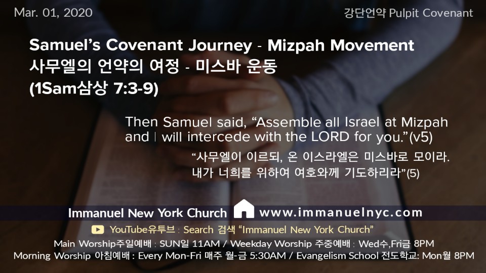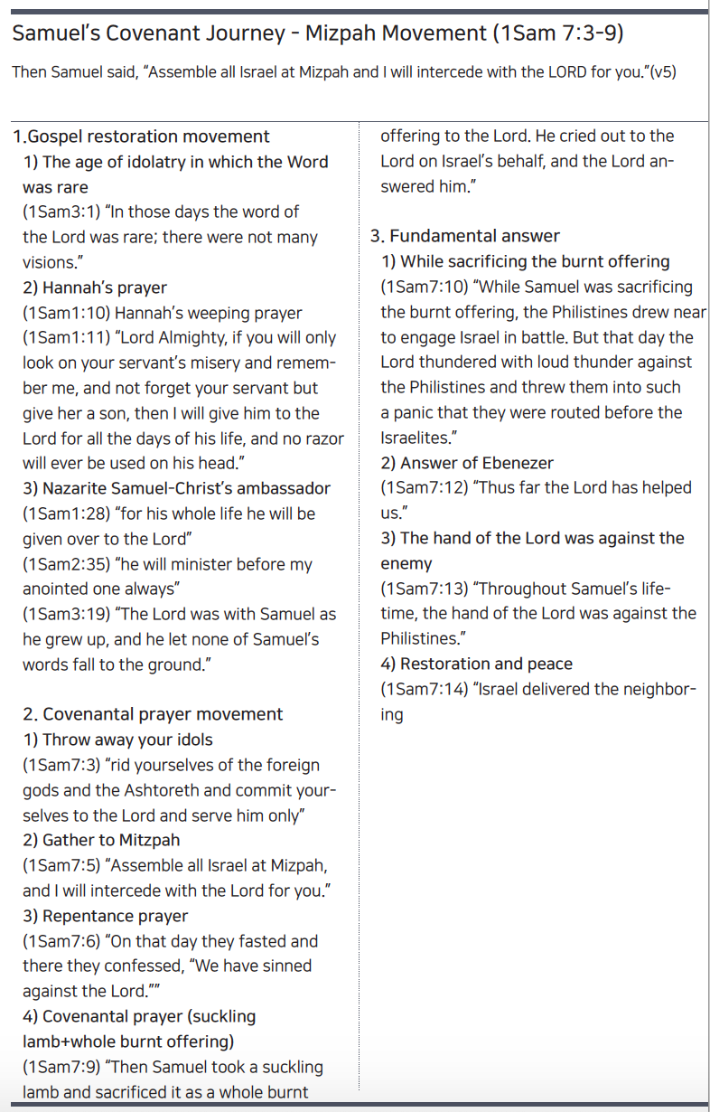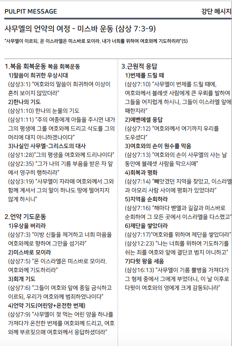 3사무엘이 이스라엘 온 족속에게 말하여 이르되 만일 너희가 전심으로 여호와께 돌아오려거든 이방 신들과 아스다롯을 너희 중에서 제거하고 너희 마음을 여호와께로 향하여 그만을 섬기라 그리하면 너희를 블레셋 사람의 손에서 건져내시리라 4이에 이스라엘 자손이 바알들과 아스다롯을 제거하고 여호와만 섬기니라 5사무엘이 이르되 온 이스라엘은 미스바로 모이라 내가 너희를위하여 여호와께 기도하리라 하매 6 그들이 미스바에 모여 물을 길어 여호와 앞에 붓고 그 날 종일 금식하고 거기에서 이르되우리가 여호와께 범죄하였나이다 하니라 사무엘이 미스바에서 이스라엘 자손을 다스리니라 7 이스라엘 자손이 미스바에 모였다 함을 블레셋 사람들이 듣고 그들의 방백들이 이스라엘을 치러 올라온지라 이스라엘 자손들이 듣고 블레셋 사람들을 두려워하여 8 이스라엘 자손이 사무엘에게 이르되 당신은 우리를 위하여 우리 하나님 여호와께 쉬지 말고 부르짖어 우리를 블레셋 사람들의 손에서 구원하시게 하소서 하니 9사무엘이 젖 먹는 어린 양 하나를 가져다가 온전한 번제를 여호와께 드리고 이스라엘을위하여 여호와께 부르짖으매 여호와께서 응답하셨더라